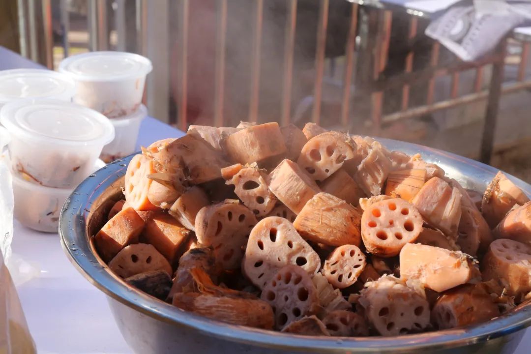 记者看到,除了粥,还有咸菜和好几大盆藕。“这也是我们自己种哒!”粉嘟嘟香喷喷的藕块儿,也会一同发给村民们品尝。