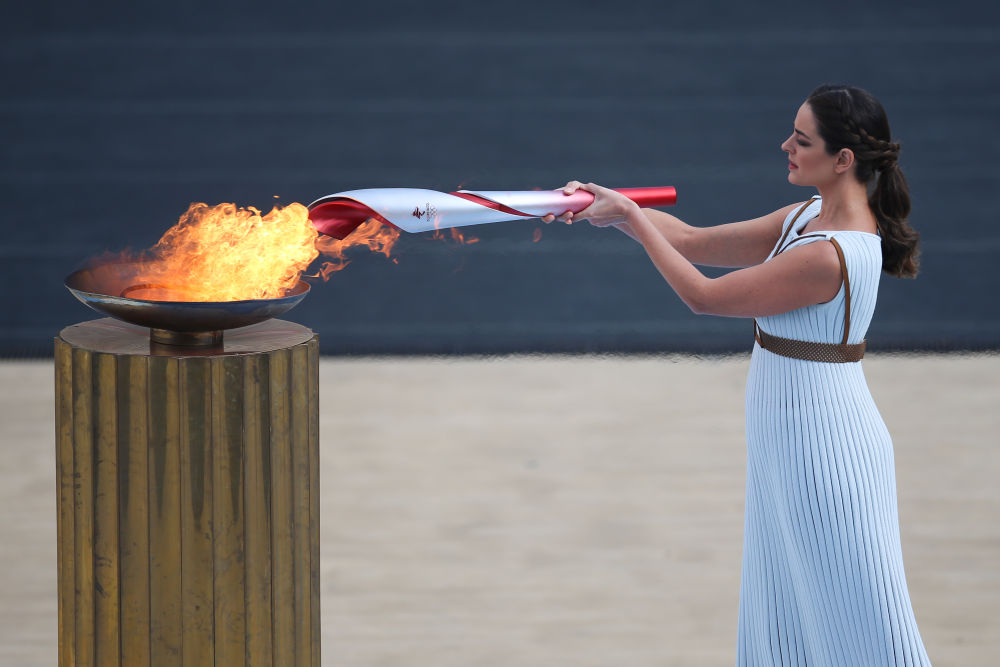 10月19日,扮演最高女祭司的演员乔治乌从圣火盆点燃北京冬奥会火炬。 新华社记者郑焕松摄