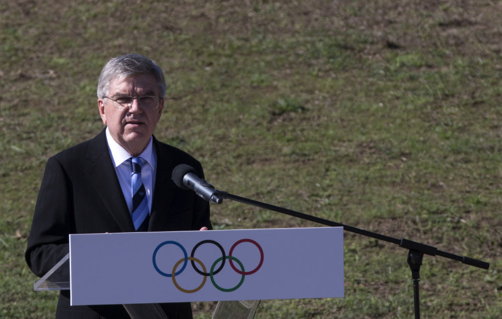 10月18日,国际奥委会主席托马斯·巴赫在北京冬奥会火种采集仪式上致辞。新华社发(马里奥斯·罗洛斯摄)