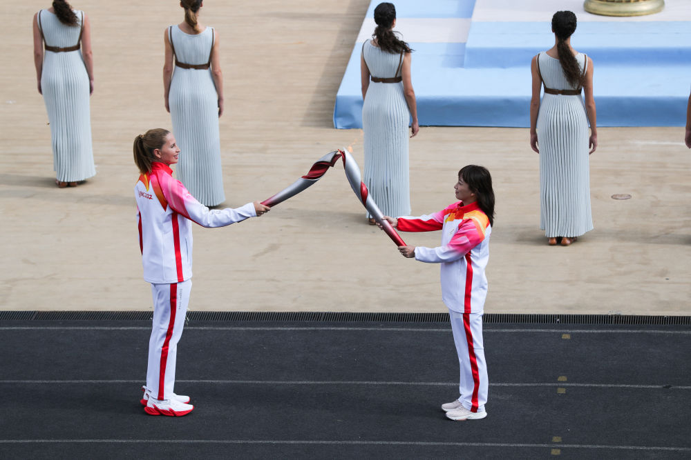 10月19日,希腊奥委会主席斯皮罗斯·卡普拉洛斯将火炬交给北京冬奥组委特别代表、北京冬奥组委副主席于再清(右)。 新华社发(马里奥斯·罗洛斯摄)