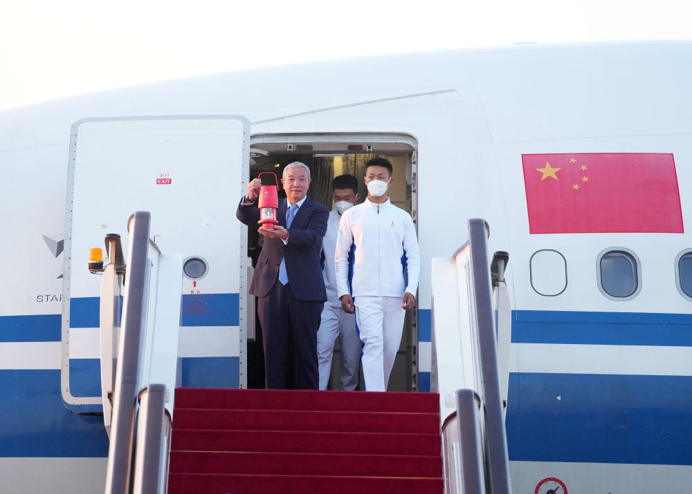 10月20日,在北京首都机场,北京冬奥组委特别代表、北京冬奥组委副主席于再清(左)手持火种灯走出舱门。 新华社记者张晨霖摄