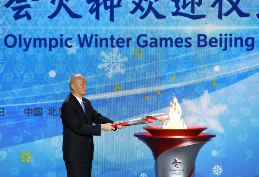 10月20日,北京市委书记、北京冬奥组委主席蔡奇在火种欢迎仪式上点燃仪式火种台。 新华社记者张晨霖摄