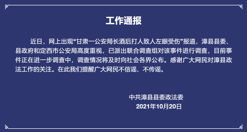 针对“甘肃省定西市漳县公安局一名副局长被指酒后打人致左眼受伤”一事,10月20日,漳县县委政法委发布工作通报称,针对此事,漳县县委、县政府和定西市公安局已派出联合调查组对该事件进行调查,目前事件正在进一步调查中,调查情况将及时向社会各界公布。