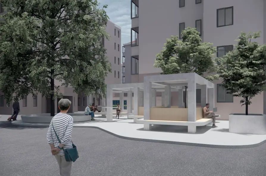 取消该区域停车位,打造休闲步道及花园景观,增设休息、阅读和社交区域,同时升级优化现有绿化,使该区域成为居民日常活动中心。