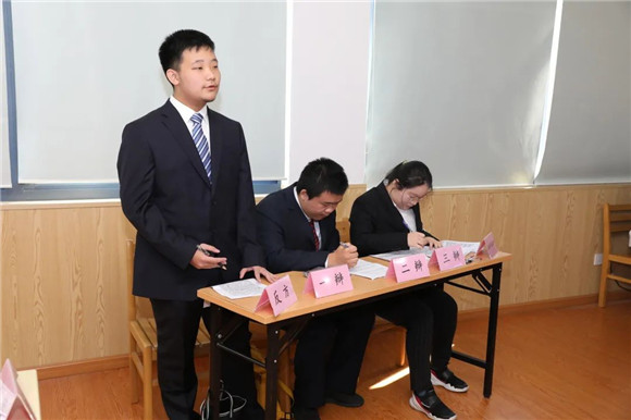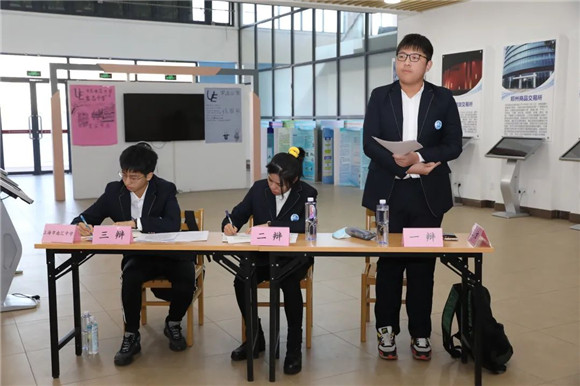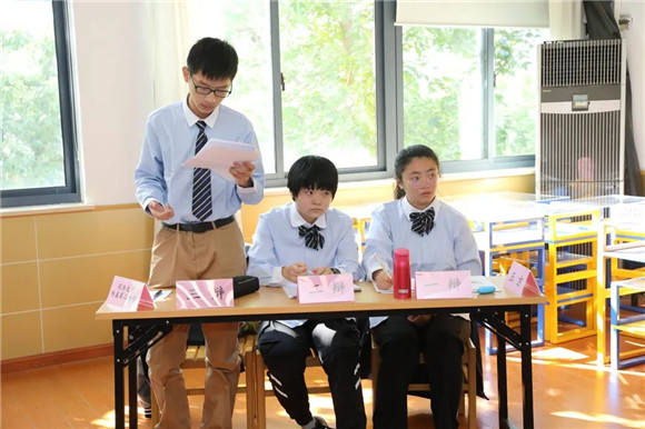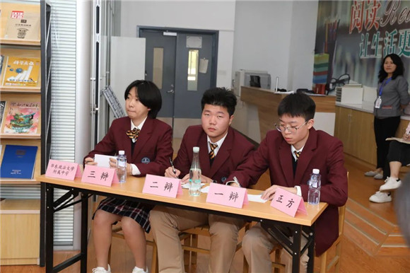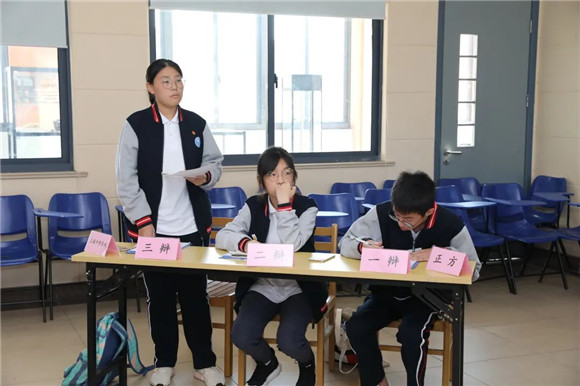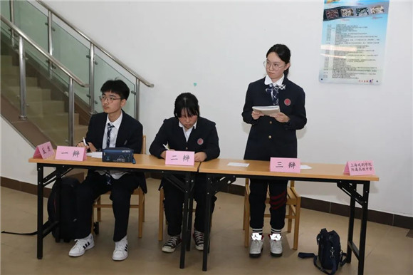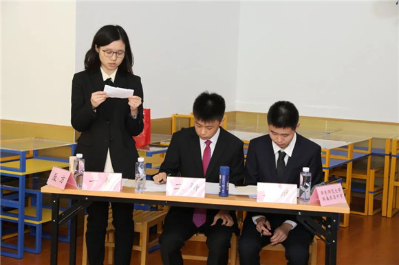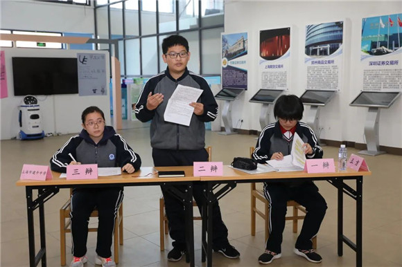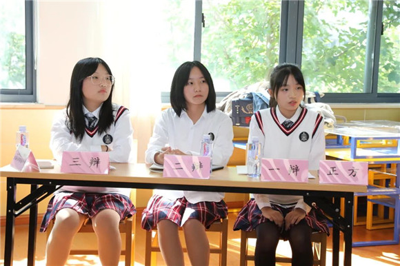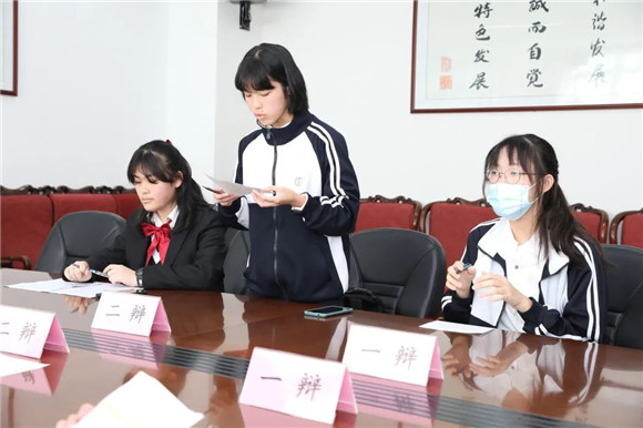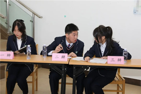 辩论赛开幕式由高一11班刘诗菡同学主持,上午的辩论赛工作人员由学校辩论社的15位同学承担,下午的复赛工作人员由学校微电影社的9位同学承担。上午的初赛第一场9:30-10:10分四个场地进行,第二场10:30—11:00分五个场地,每个场地都有评审专家、教师评委、学生评委共同审议产生每场优胜方及一位最佳辩手。