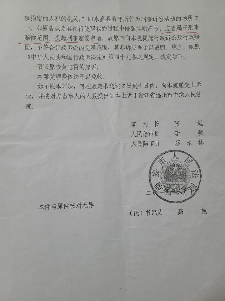 尽管黄志霄和永嘉县公安局各执一词,但瑞安市人民法院却并未给出调查结论,而是以“永嘉县看守所作为刑事诉讼活动的场所之一,如黄志霄认为其在行使职权的过程中侵犯其财产权,应当属于刑事赔偿范围,提起刑事赔偿申请”为由,驳回了黄志霄的起诉。2019年11月,黄志霄上诉至温州市中级人民法院,依旧被以相同理由驳回。2020年4月,浙江省高级人民法院又驳回了黄志霄的行政诉讼再审申请。“我研究了国内很多判决案例,法院都把看守所作为行政机关对待,其所内行为属于行政行为,所以我始终认为本案也应属于行政赔偿范畴。“