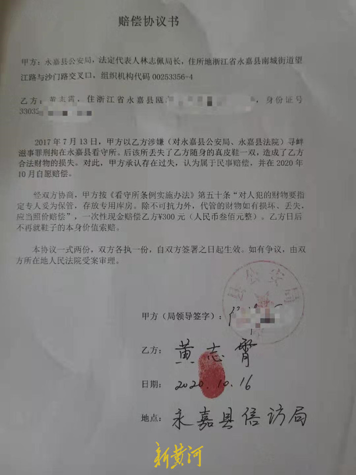 黄志霄跟永嘉县看守所“较真”的,其实并非只有这一件事。2018年7月12日,黄志霄出狱当日在领取被扣押的物品时,发现自己所穿的皮鞋不见了。永嘉县看守所承认鞋子是在看守所不见的,却拒绝给予相应赔偿。黄志霄先是找到永嘉县公安局控申科反映问题,在没有得到回应之后,2018年12月起不断向法院提起诉讼,要求归还鞋子或按折旧价赔偿。之后,黄志霄几乎经历了跟讨要78.2元一样的境遇,行赔、刑赔、民赔被各级法院逐一驳回。在黄志霄的不断申诉下,2020年10月,永嘉县公安局最终与黄志霄签订了《赔偿协议书》,承认看守所存在过失,认为此事属于“民事赔偿”,一次性现金赔偿黄志霄300元,要求黄志霄不再追究此事。