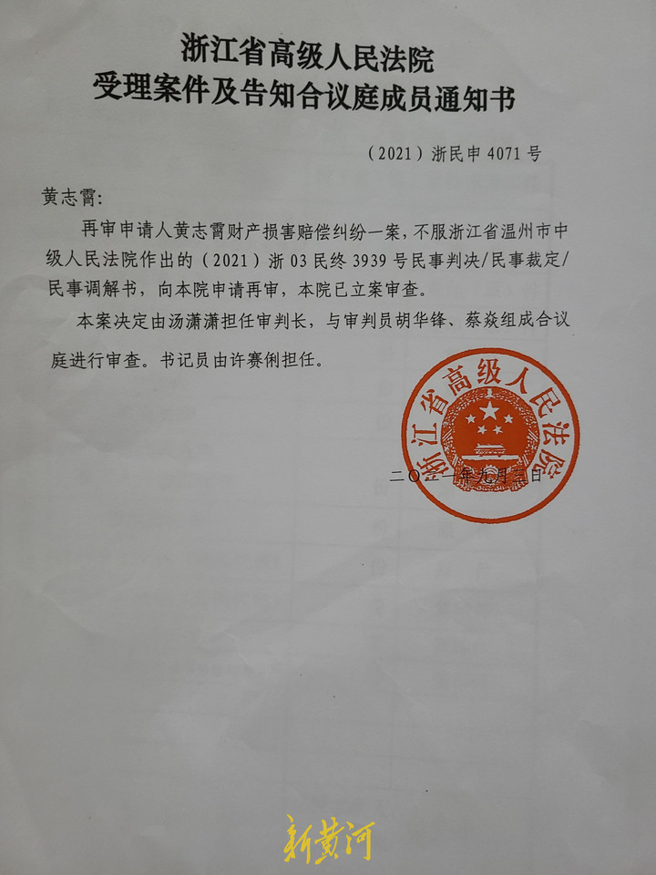新黄河记者了解到,针对申请78.2元赔偿一事,今年8月,黄志霄已继续上诉至浙江省高级人民法院,目前浙江省高院已针对该案件立案审查。