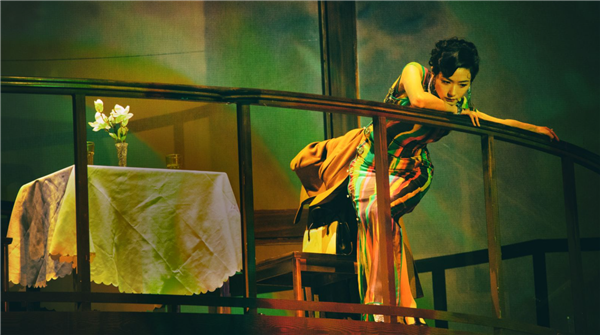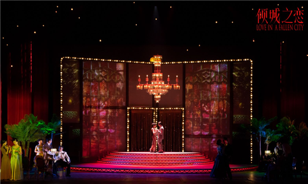 不同于常见在戏剧舞台上的实时影像技术,《倾城之恋》中的电影部分,是到百乐门提前拍摄的。还原上世纪40年代的布景,对于电影剧组来说轻而易举,但叶锦添追求的是一种真实的历史感,因而赶赴实景录制。开场的7分钟群舞,他请来国际知名编舞家蔡敏仪,还原上海滩的氛围感。道具细致到白家餐桌上的菜肴、梳妆台上的香水瓶,甚至是角色手中的几枚美元,都如实复刻时代印迹。