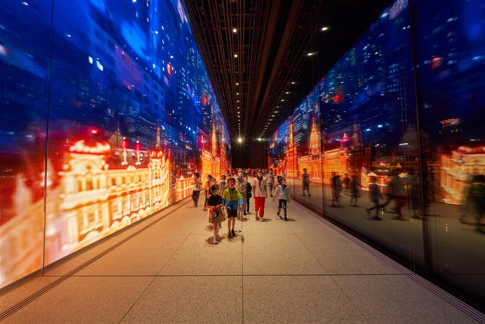 18时,站在浦东美术馆亲水平台,夕阳已沉入万国建筑群背后,白天的自然光线在美术馆建筑表面一点点褪去。轮廓灯亮起,白天看起来“白盒子”式的美术馆,在夜晚散发出了一种金黄的光晕。西侧外墙“大玻璃”准时亮起倒计时,这是美术馆特别为开馆年定制的《镜厅秀演》,短短数分钟的影片,展现出上海城市发展变迁与人类对科技、文化和艺术的瑰丽探索。而穿梭于镜厅的观众,与这播放的影像大屏一起,构成了充满让·努维尔式诗意的“第四维度”空间。