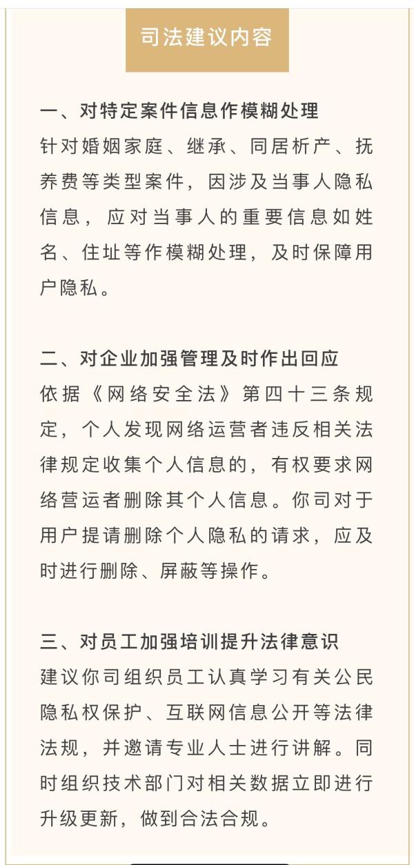 10月21日,执行相关案件的南京市栖霞区法院了解情况后,向企查查科技有限公司发送司法建议,针对婚姻家庭等类型案件,应及时保障用户隐私,对于用户提请删除个人隐私的请求,公司应及时进行删除、屏蔽等操作。