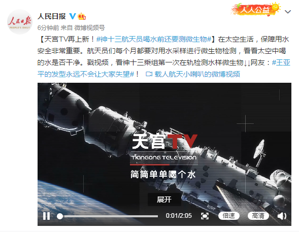 【天宫TV再上新!#神十三航天员喝水前还要测微生物#】在太空生活,保障用水安全非常重要。航天员们每个月都要对用水采样进行微生物检测,看看太空中喝的水是否干净。戳视频,看神十三乘组第一次在轨检测水样微生物↓↓网友:#王亚平的发型永远不会让大家失望#!