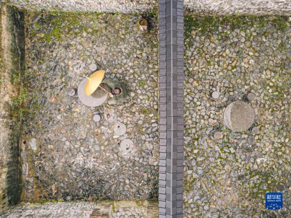 11月2日,在浙江省杭州市临安区锦南街道横岭村,潘云峰在小院内检查自己编成的一把竹伞(无人机照片)。