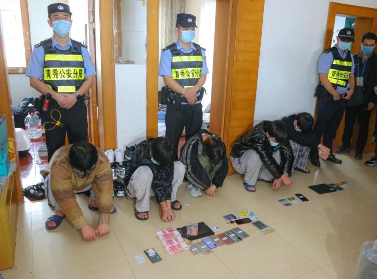 2021年11月4日17时许,青秀公安分局在南宁市青秀区星湖路某小区捣毁一处跑分洗钱窝点,抓获犯罪嫌疑人谭某某等共5人,现场缴获作案用银行卡13张,作案用手机、平板电脑等。