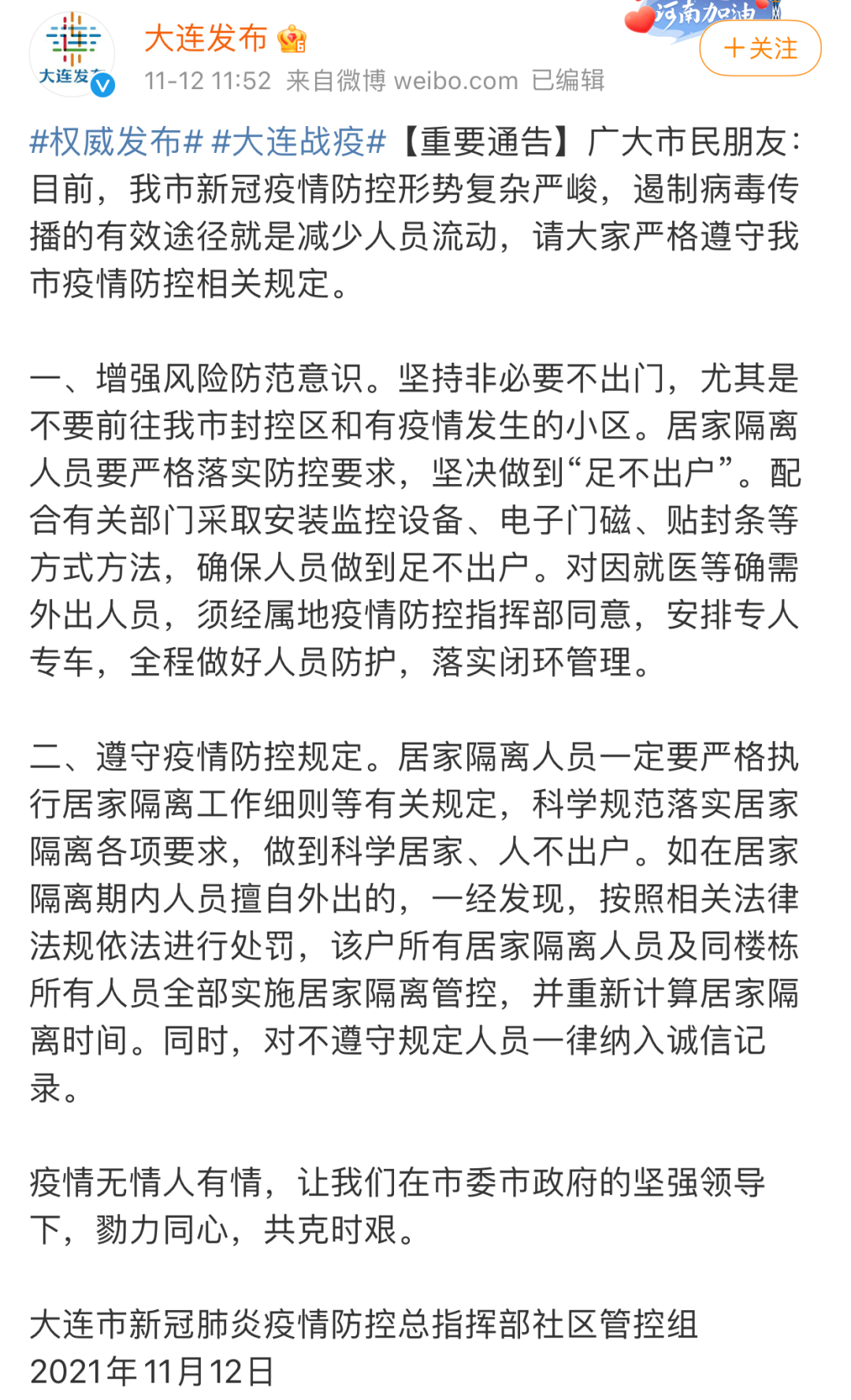 确诊病例135:庄河市大学城就读学生,居住在学校宿舍。11月11日在重点人群主动排查中核酸检测阳性,随即转入省新冠肺炎集中救治大连中心隔离治疗,经省专家组会诊均为确诊病例(普通型)。