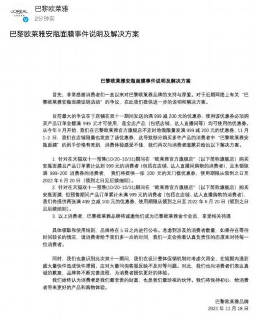 11月18日晚间,巴黎欧莱雅针对部分购买多件产品的消费者中“巴黎欧莱雅安瓶面膜”的到手价格有差别,消费体验感受不佳,再次向消费者道歉。并给出以下解决方案: