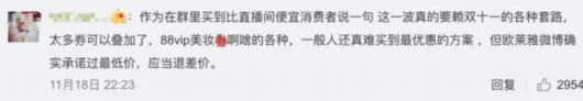因面膜差价事件遭消费者投诉、头部主播“封杀”,巴黎欧莱雅深夜道歉。然而将问题归咎于繁琐的促销机制,对涉嫌虚假宣传、虚假发货以及售后服务差等避重就轻,并不能得到消费者认可。双11本该是得实惠的“购物狂欢”,而不该成为忽悠消费者的“套路比拼”。匡威斐乐预付定金消费者反而多花钱、付款10天不见欧莱雅、薇诺娜直播声称没货……