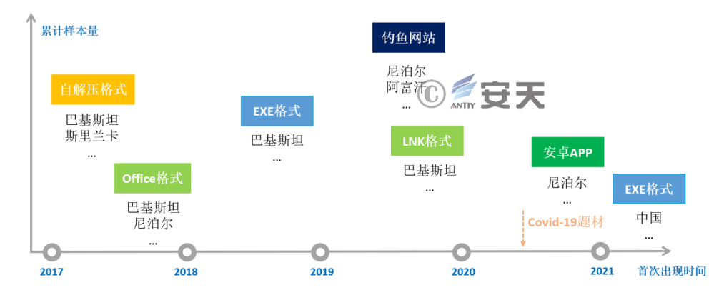 图 1-1幼象组织不同攻击技术首次被发现的时间轴和对应攻击的目标国家