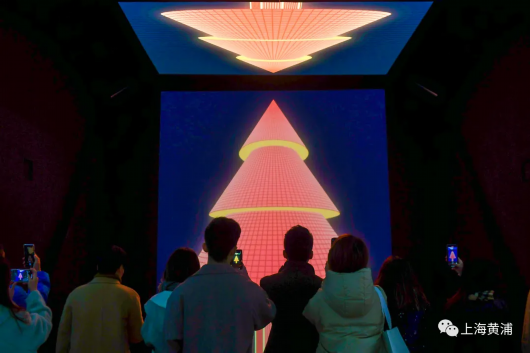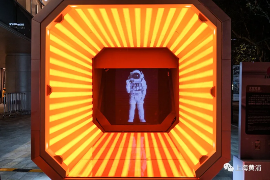 位于马当路沿街的《太空走廊》则以宇航员的全息影像和富有科技感灯带设计,通过自有设备预置的光控程序将其景观化,赋予观者时空穿梭的科幻视觉体验。