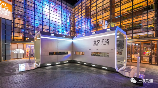 新天地时尚Ⅰ户外广场上的《廿空间站》代表了一座社区式宇宙空间站的基本单元,可以满足人们居住、交通、社交、审美等全部日常需求。它长达17米,高5米,以局部舱体高达每平方米200个以上的可操控按键,总计10万个电子元件组合改造,极致还原了空间站的外观和内部细节。
