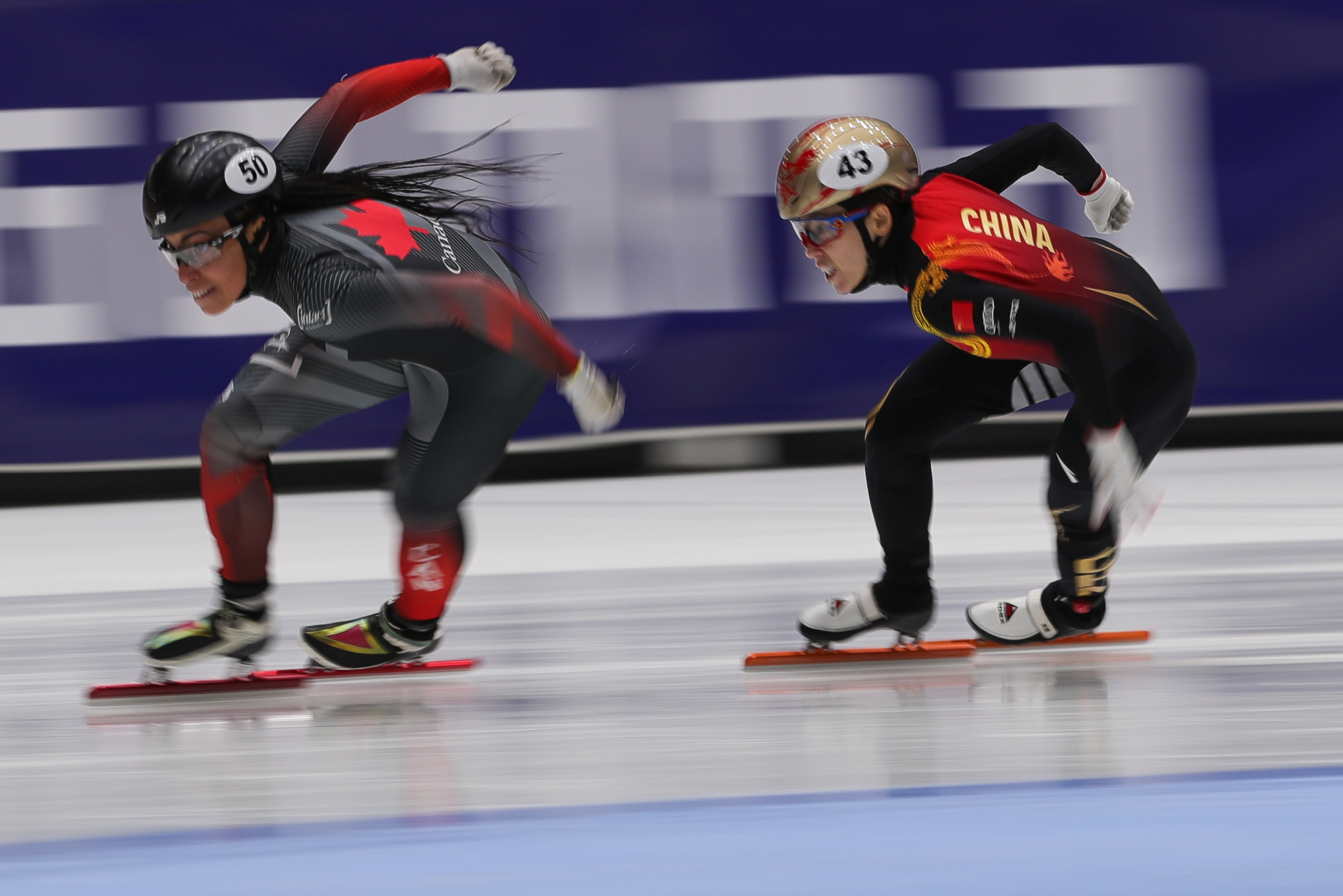 11月25日,中国队选手范可新(右)在女子500米小组赛以43秒178的成绩列小组第二。新华社记者郑焕松摄