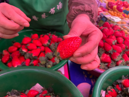 刚上市两周左右的草莓,产量还未到高峰期,尽管只在水果摊位上占据一个小角落,依旧不时有人前来询价品尝。
