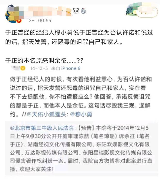网易娱乐12月1日报道  近日,于正新剧《当家主母》疑似虐猫引发舆论风波。有网友扒出,于正昔日的经纪人穆小勇曾称于正为否认许诺和说过的话,曾指天发誓,还恶毒的诅咒自己和家人。穆小勇看不下去,提醒他“你不怕遭报应么?”于正称承诺反悔诅咒的都是于正,而他本人是余征。穆小勇表示这句话尽毁他的三观,遂解约。