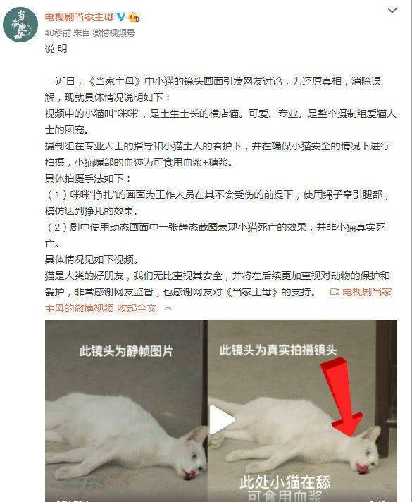 事情的起因为近日,有网友指出《当家主母》电视剧片段疑似虐猫。26日,《当家主母》官方账号在社交平台上发文辟谣,称小猫叫“咪咪”,是土生土长的横店猫。可爱、专业。是整个摄制组爱猫人士的团宠。摄制组在专业人士的指导和小猫主人的看护下,并在确保小猫安全的情况下进行拍摄,小猫嘴部的血迹为可食用血浆+糖浆。