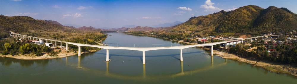 这是2021年2月5日拍摄的中老铁路琅勃拉邦湄公河特大桥(无人机拍摄)。新华社发(潘龙柱摄)