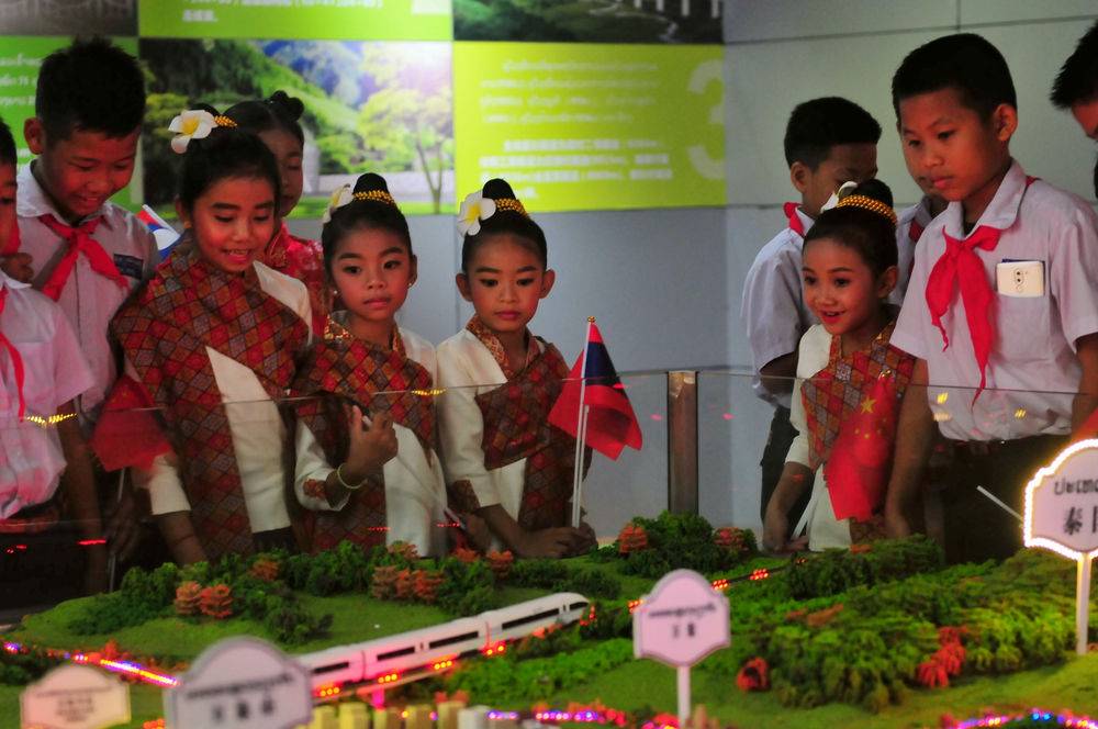 2019年6月1日,在老挝万象,中老友好农冰村小学学生参观中老铁路展示馆。新华社记者章建华摄