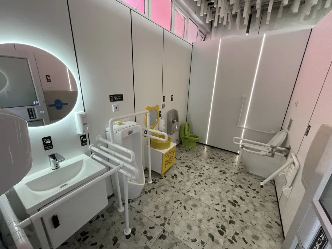 无障碍厕间内,配备了带安全抓杆的坐便器及隔间厕位。