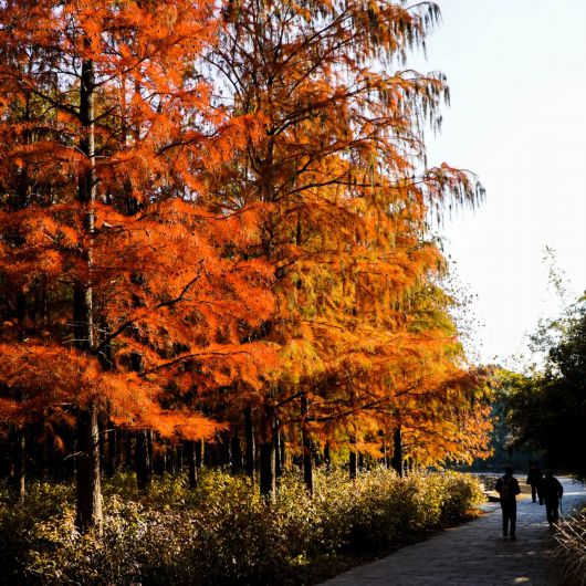 杉树树干高大挺直,如仪仗队一样挺立着,一排排地把路延伸,引人走进一副唯美的秋景图。
