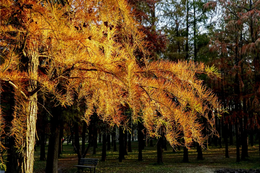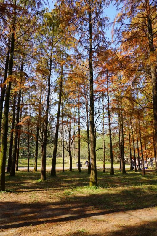 公园内杉树种类繁多,包括水杉、池杉、落羽杉、东方杉、中山杉、柳杉等,其中以池杉最多。杉树喜欢温暖湿润的生长环境,因而通常可以在沿着湖边或河边甚至水中寻找到杉树的曼妙身姿。