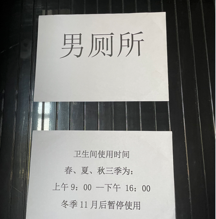 卫生间使用时间春、夏、秋三季为上午9时至下午4时,冬季11月后暂停使用。”厕所门前,遍地尿渍和污秽的痕迹,地上还散落着很多卫生纸团,散发着异味。