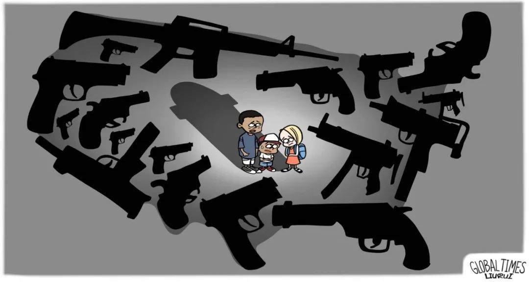 ▲枪支暴力将美国一幕幕魔幻的法治荒诞剧推向高潮。(漫画| 刘蕊)