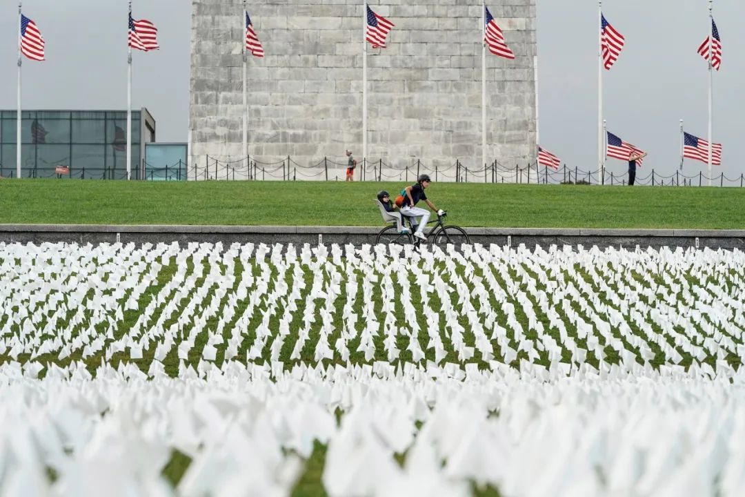 ▲2021年9月,美国华盛顿特区国家广场上竖起了60多万面白旗,以此纪念在新冠疫情中死去的人,每面白旗代表一条生命。这场展览被命名为“在美国:记住”(In America: Remember)。