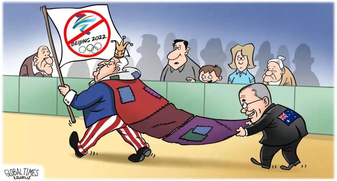 ▲美国拒绝联署北京冬奥会奥林匹克休战决议,宣称“外交抵制”北京冬奥会,才是祸害世界和平的毒瘤。而澳大利亚等国甘当侍从,卑微托起美国破烂不堪的披风。(漫画| 刘蕊)