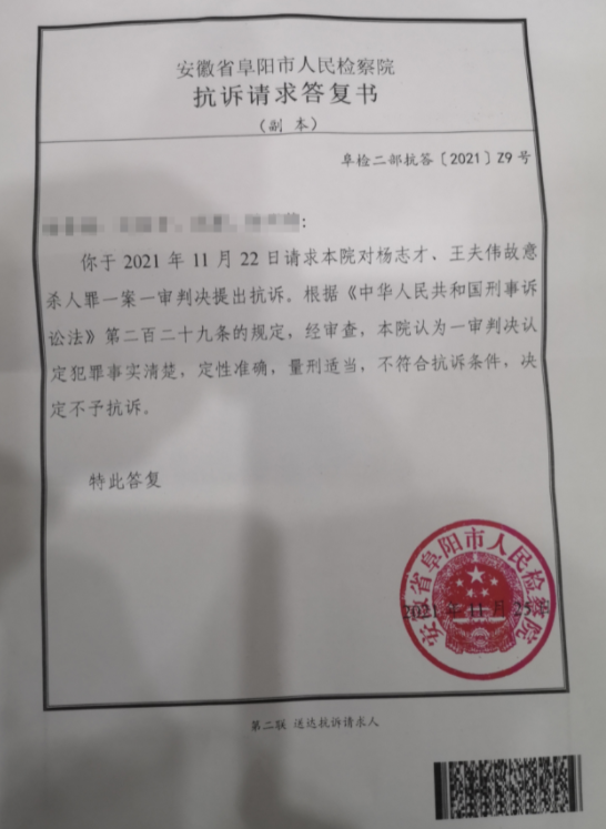 12月14日,澎湃新闻(www.thepaper.cn)从河南“亿万富商杀人案”受害人梅丽的家属处获悉,他刚刚收到安徽省阜阳市人民检察院于11月25日作出的《抗诉请求答复书》,阜阳市检察院决定对杨志才、王夫伟故意杀人罪一案不予抗诉。