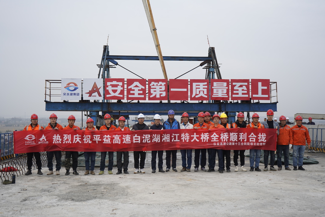 12月14日下午,平益高速白泥湖湘江特大桥全幅贯通,标志着湖南省重点建设项目——平益高速主线控制性工程全部完成,为项目明年底建成通车打下了坚实基础。