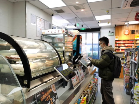 便利蜂特色之一便是智慧零售,在这家新店内同样能找到各种方便快捷的智能装置和元素,如可实现自助购买的“智慧大屏”和自动改价的“电子价签”等。记者采访期间发现不少顾客通过“智慧大屏”购买包子、豆浆等早点,购买过程仅需几分钟,除了打包食物外,全程都可自行操作。而其他品类商品,顾客则可通过自助购物机器完成。