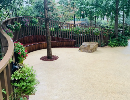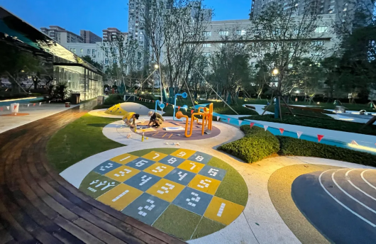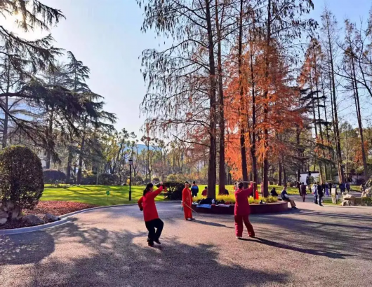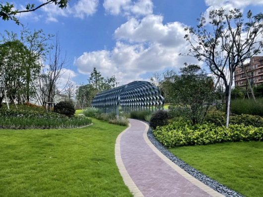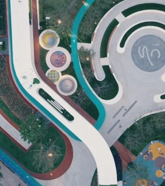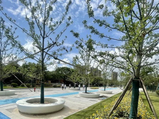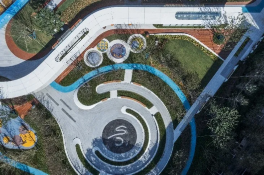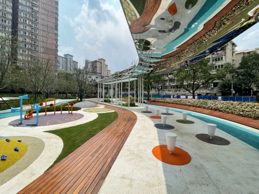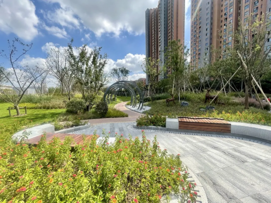 乐山绿地以“乐”字为主题,基于“仁者乐山、智者乐水”的寓意,将中国园林的山水观融于绿地设计中,新增智慧健身设施。塑造完整的“四季景观”,旨在为居民群众打造一个全时段游憩、全年龄共享、全空间造景的口袋公园。