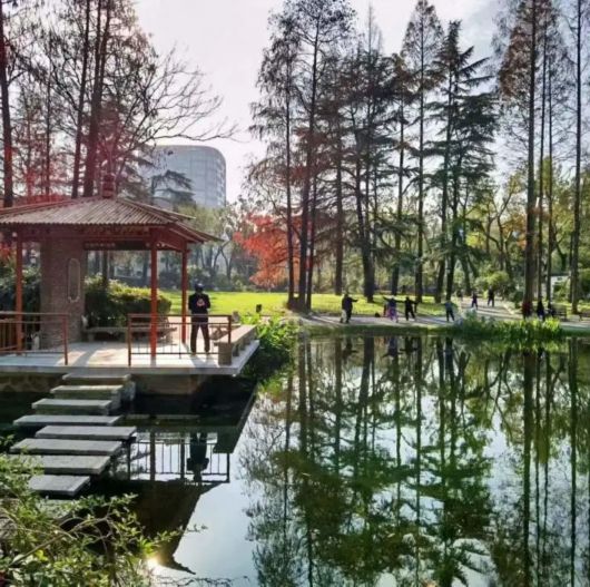 徐汇区东安公园通过改造,打造了杏花春雨、雅竹幽篁、翠微弄影、合欢书香、寒梅傲雪、藤萝花语、榉萸有芳、秋枫桂香八大特色景区,将“海绵城市”理念贯穿生态花境、水岸森林全过程。