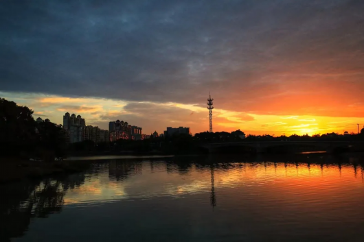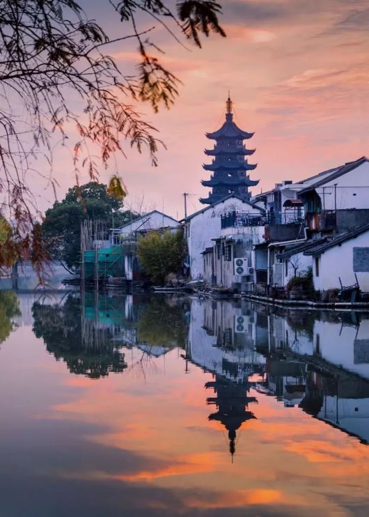 古雅建筑群与绚烂霞光,相映成趣,水中的倒影与现实形成一个完美的平衡,如同一幅多彩的油画。