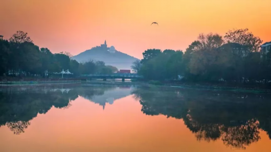 湖面波澜不惊,天边日光消融,远远望去,一切景物统统笼罩在暖暖的余晖里,静谧而悠然。