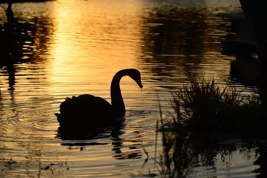 落日余晖如同星光,微波在柔光里荡漾,湖里的天鹅低头戏水,一切岁月静好。