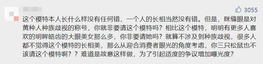 对于这些网友我真的也很无语,其中有一条评论明明模特眼睛很大画成这么小哈哈哈哈我笑出了声音突然遭受到网络暴力我真的也很无奈,我真的有被气笑了,相是父母给的,可能每个人审美不一样,也许有些朋友欣赏不了我这种类型,但是也大可不必这样来攻击我,萝卜白菜各有所爱。我眼睛就是这样,甚至生活中比这还细小。那是不是说长这样了就不该选择模特这个职业?长这样了出生那天就在辱华了?那是不是也可以告你歧视了?爱国我举双手赞成!但事事都要上纲上线,那这就是一种病态了!大家做一个心态健康的网民吧。
