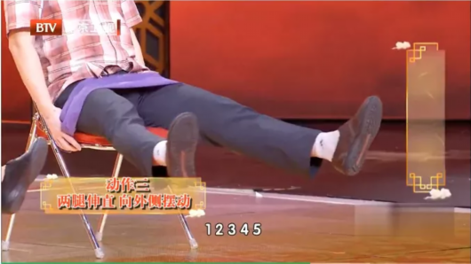 动作一:身体坐直,两手下垂,两脚抬起绷直5秒,做8~10次,促进血液回流。