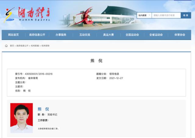 此外,湖南省体育局官网“机构领导”栏目显示,熊倪目前主持省体育局全面工作。