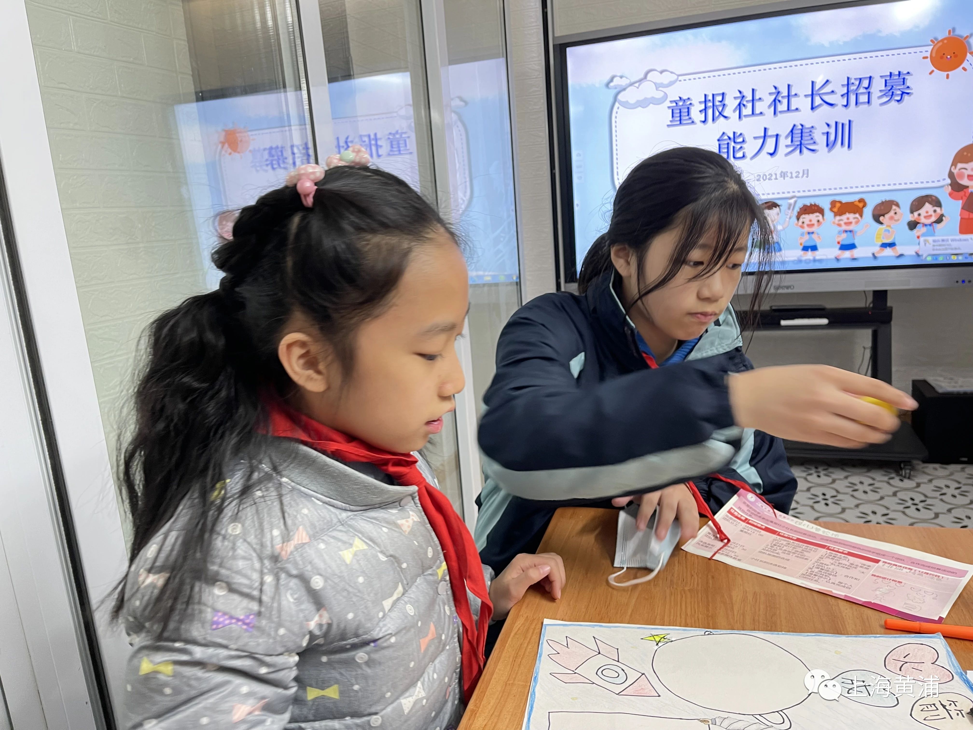 12月21日,11名候选人在课后看护社团活动时间再次来到童报社,在每个团队专属的导师带领下进行“能力集训”。导师们从版面的制作、构图着色、文字呈现、介绍分享等不同角度进行培训。随后,选手们开始排版、绘制、合成……大家分工明确、共同协作,发挥奇思妙想,努力通过图文并茂的形式展现版面的特色,团队的亮点。