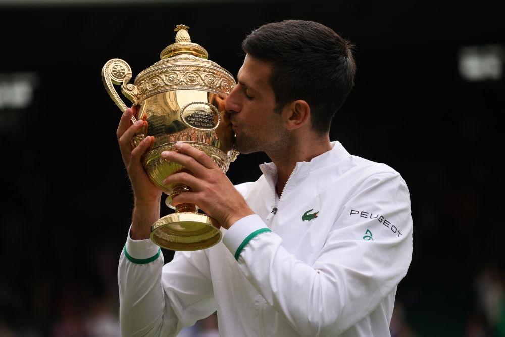 这是2021年7月11日,焦科维奇在英国伦敦举行的2021温布尔登网球公开赛男子单打颁奖仪式上亲吻奖杯。新华社发(蒂姆·爱尔兰摄)